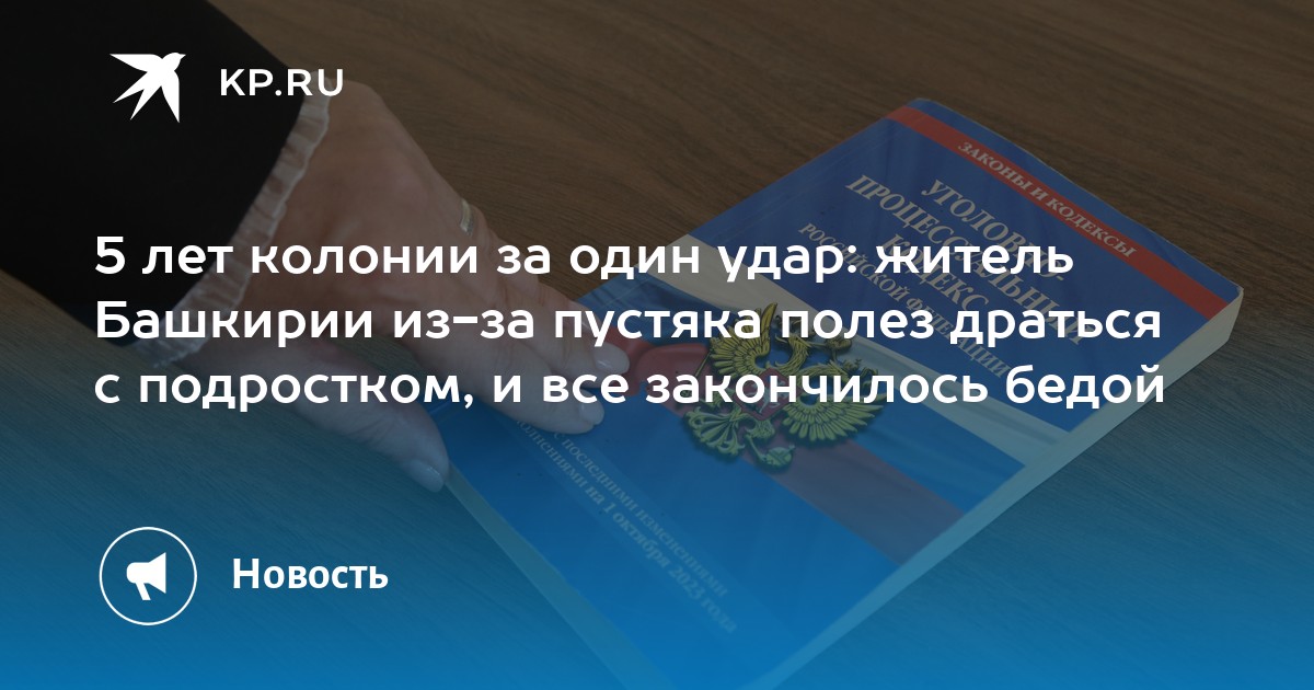 *5 лет колонии за один удар: житель Башкирии из-за пустяка полез драться с подростком, и все закончилось бедой* В Белебее местный суд вынес приговор мужчине, избившему 16-летнего подростка после неразберихи на улице. Преступление произошло из-за недоразумения, и пострадавший получил травмы средней тяжести. Мужчина, ранее судимый за наркопреступление, получил пять лет в колонии.