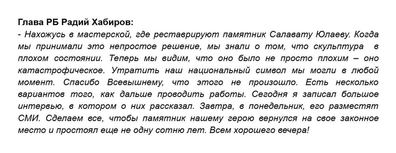 *Глава Башкирии рассказал о реконструкции памятника Салавату Юлаеву* Глава Башкирии Радий Хабиров оценил ход реставрации памятника Салавату Юлаеву, который требует тщательной очистки и восстановления. Специалисты обнаружили, что материал памятника deteriorated, highlighting the urgent need for repair to preserve this national symbol.