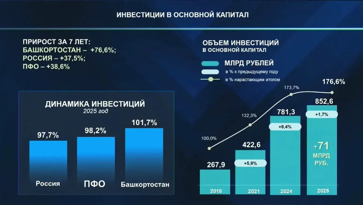 Инвестиции в экономику Башкортостана в 2025 году достигли исторического максимума 853 млрд рублей