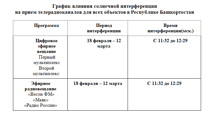 *Солнечная интерференция в Республике Башкортостан* В Башкортостане наблюдается солнечная интерференция, которая вызывает помехи в теле- и радиосигналах. Это явление временное и связано с выравниванием Солнца, спутника связи и антенны. Специалисты предупреждают зрителей о возможном ухудшении сигнала в определенные часы.